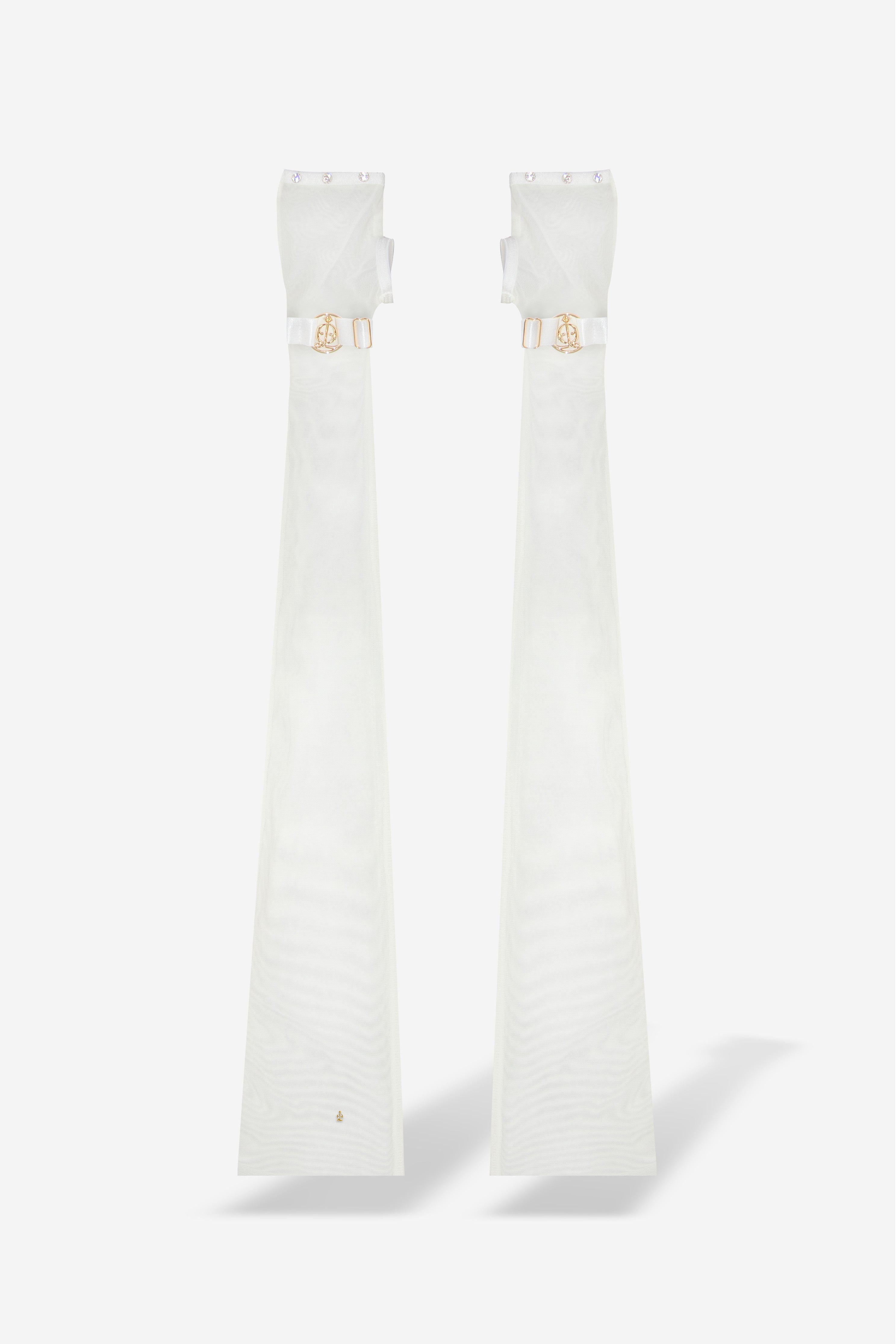 Angi Gloves are elegant sheer-mesh gloves with semi-elastic fit, clean-cut top hems, hand-sewn Swarovski Xirius Lochrose crystals and a signature 18K gold-plated wrist cuff. Ethically handmade in-house, each piece promises longevity for an everlasting love affair.