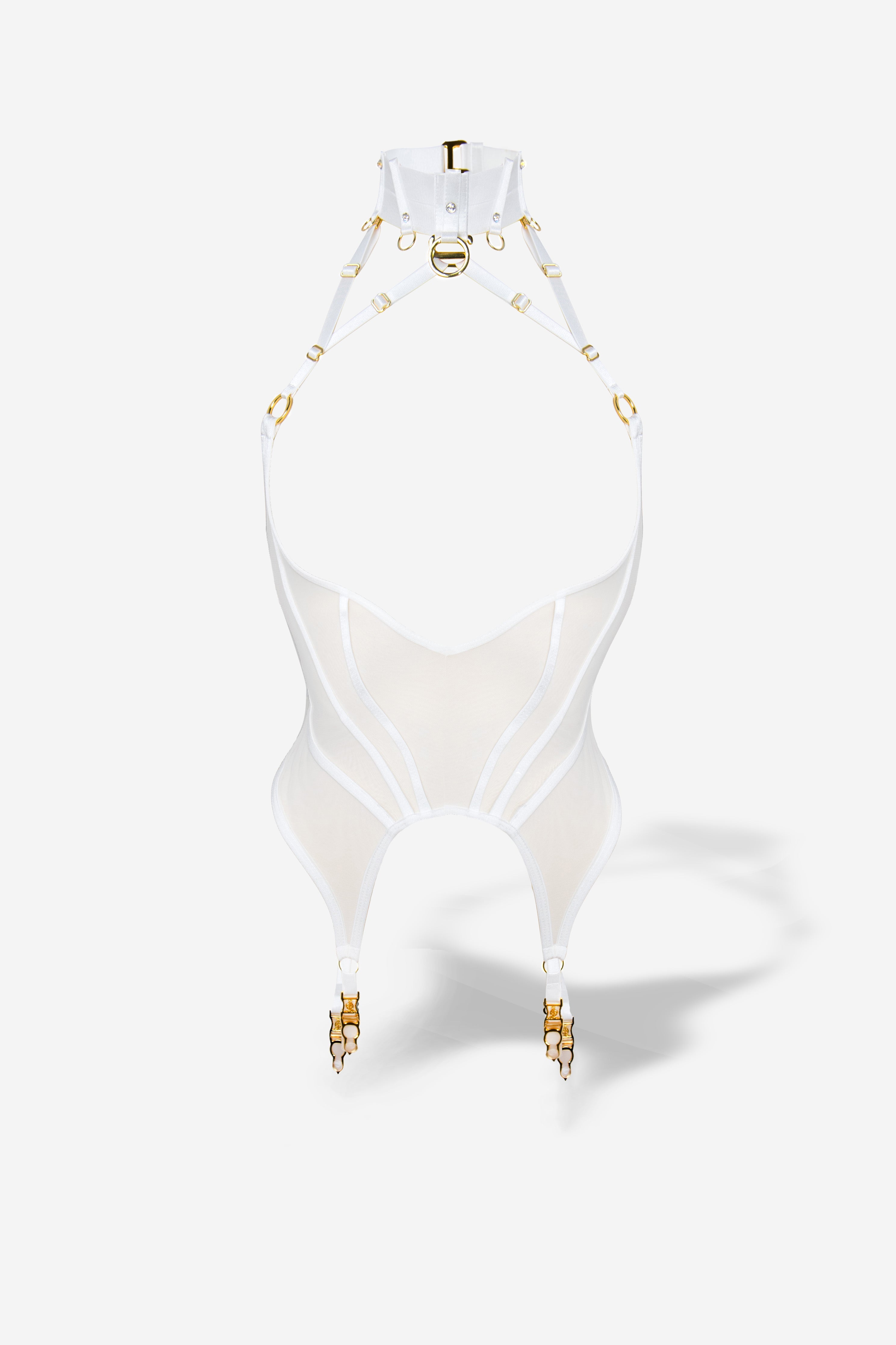Angi Waspie fuses sophistication and allure with a detachable Harlow Choker set with Swarovski Xirius Lochrose crystals, Angi contour lines sculpting the silhouette, luxurious sheer mesh and soft adjustable elastication, finished with 18K gold hardware and signature suspender clip ends. Ethically handmade in-house, each piece promises longevity for an everlasting love affair.