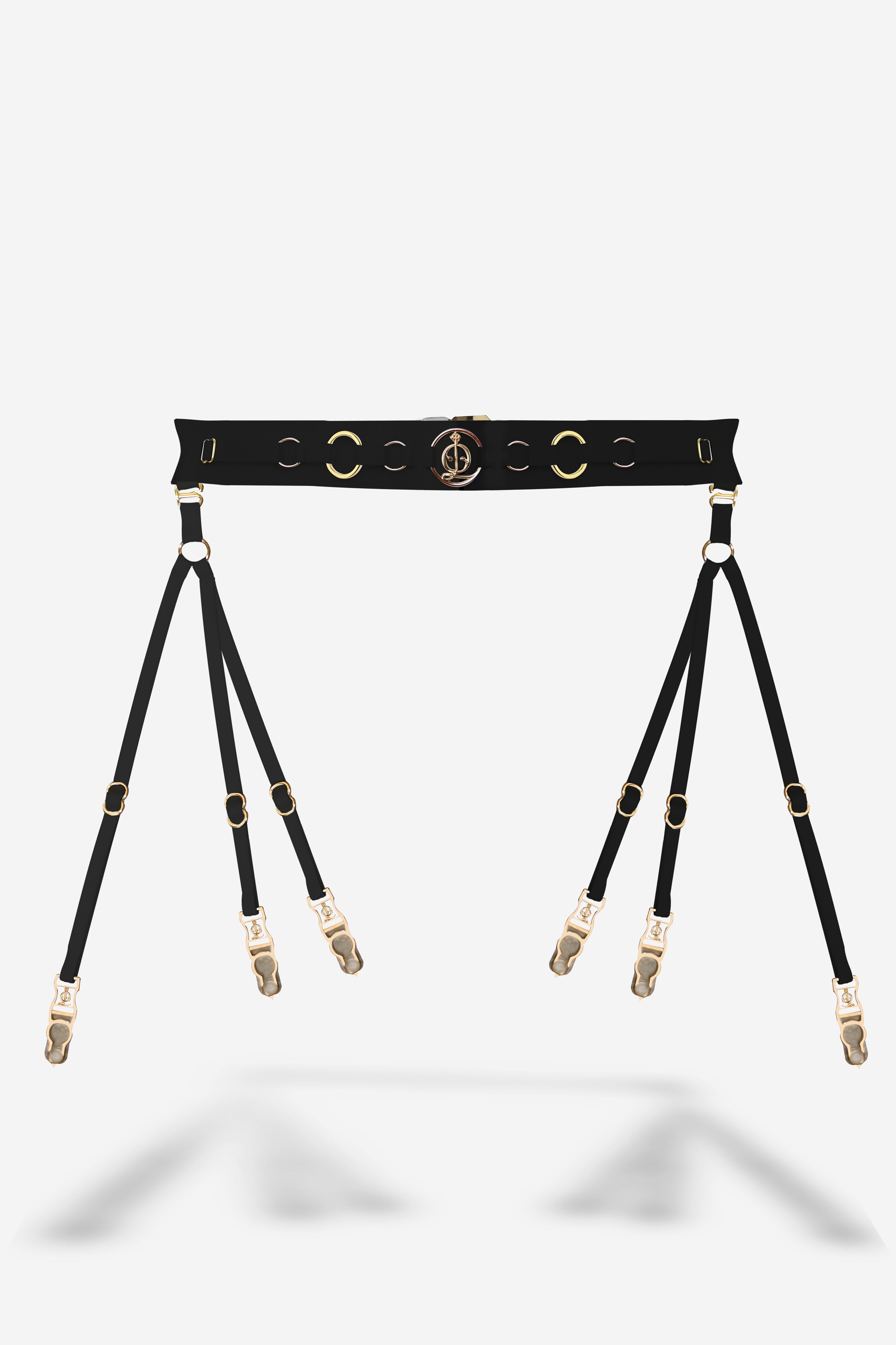 Celeste Suspender Belt is a versatile double-strap design with six suspender ends that contour and enhance legs and derrière, fully adjustable and seamlessly converting into an everyday belt by detaching the swan-hook suspender straps. Crafted from silky-smooth elastics and gleaming 18K gold-plated signature components, it empowers you to feel like a Queen. Ethically handmade in-house, each piece promises longevity for an everlasting love affair.