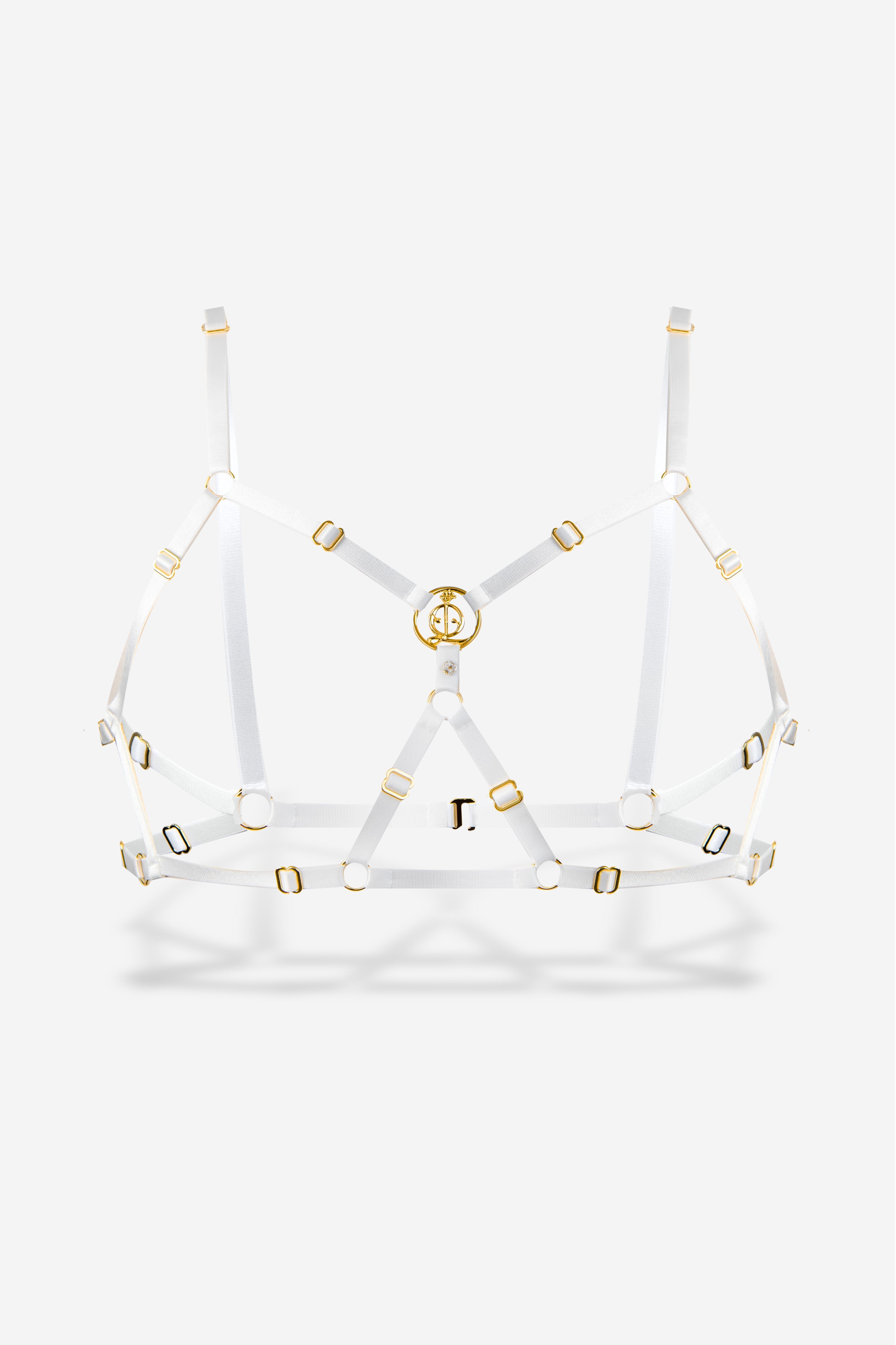Freya Bra is a harmonious blend of minimalism and captivating style—fully adjustable for a bespoke fit and effortlessly versatile whether worn under a loose shirt or dress, adorned with hand-set Swarovski Xirius Lochrose crystals, signature logo accents and 18K gold-plated hardware, meticulously crafted from premium-quality elastication for enduring elegance. Ethically handmade in Europe, each piece promises longevity for an everlasting love affair.