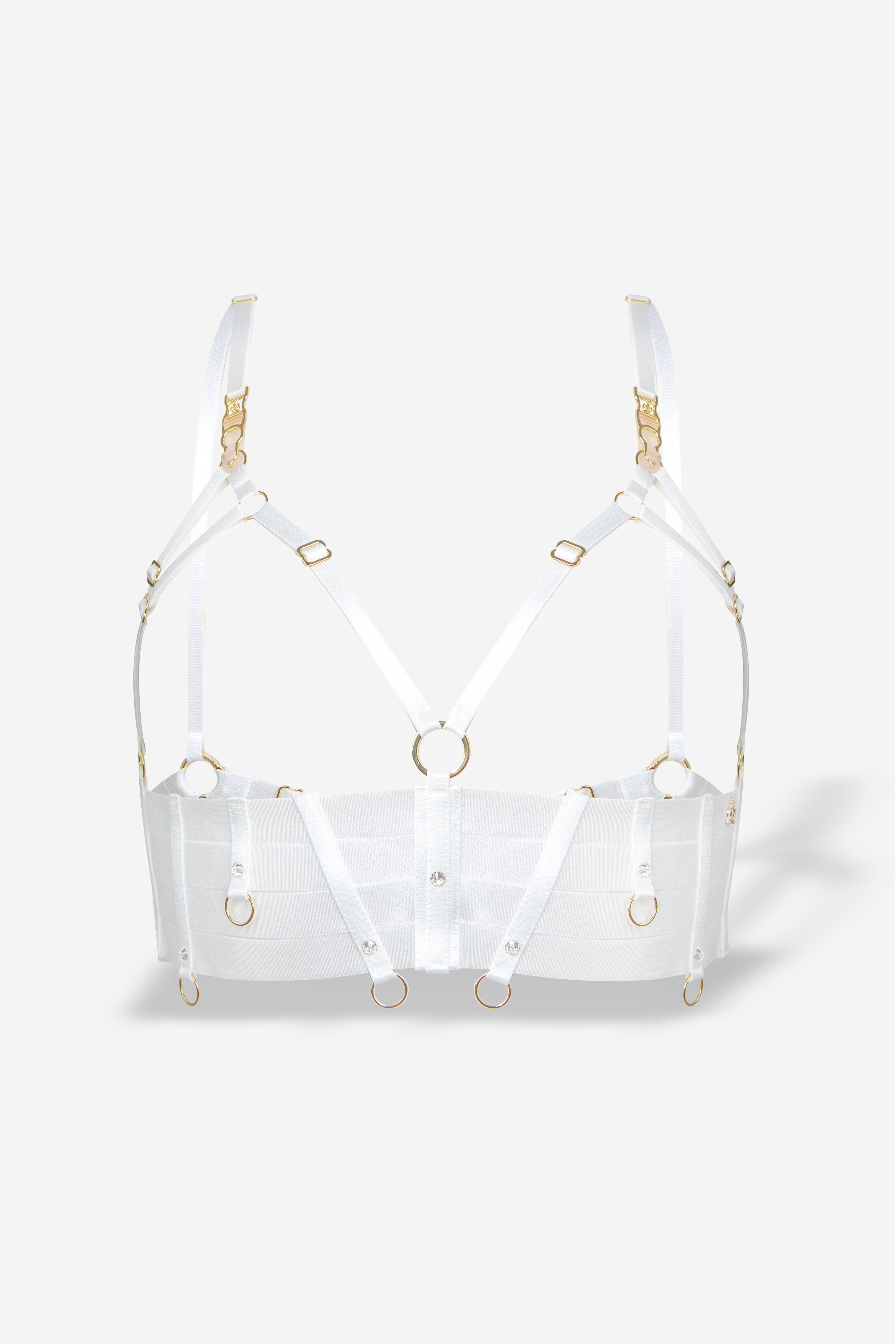 Harlow Bra is a decadent fusion of wide straps, a supportive multi-layer underband and full adjustability with 18K gold-plated hardware and signature suspender clips, meticulously finished with hand-set Swarovski Xirius Lochrose crystals, layered swan-hook fastening, contour-lined panelling and scattered ring accents for couture allure. Ethically handmade in-house, each piece promises longevity for an everlasting love affair.