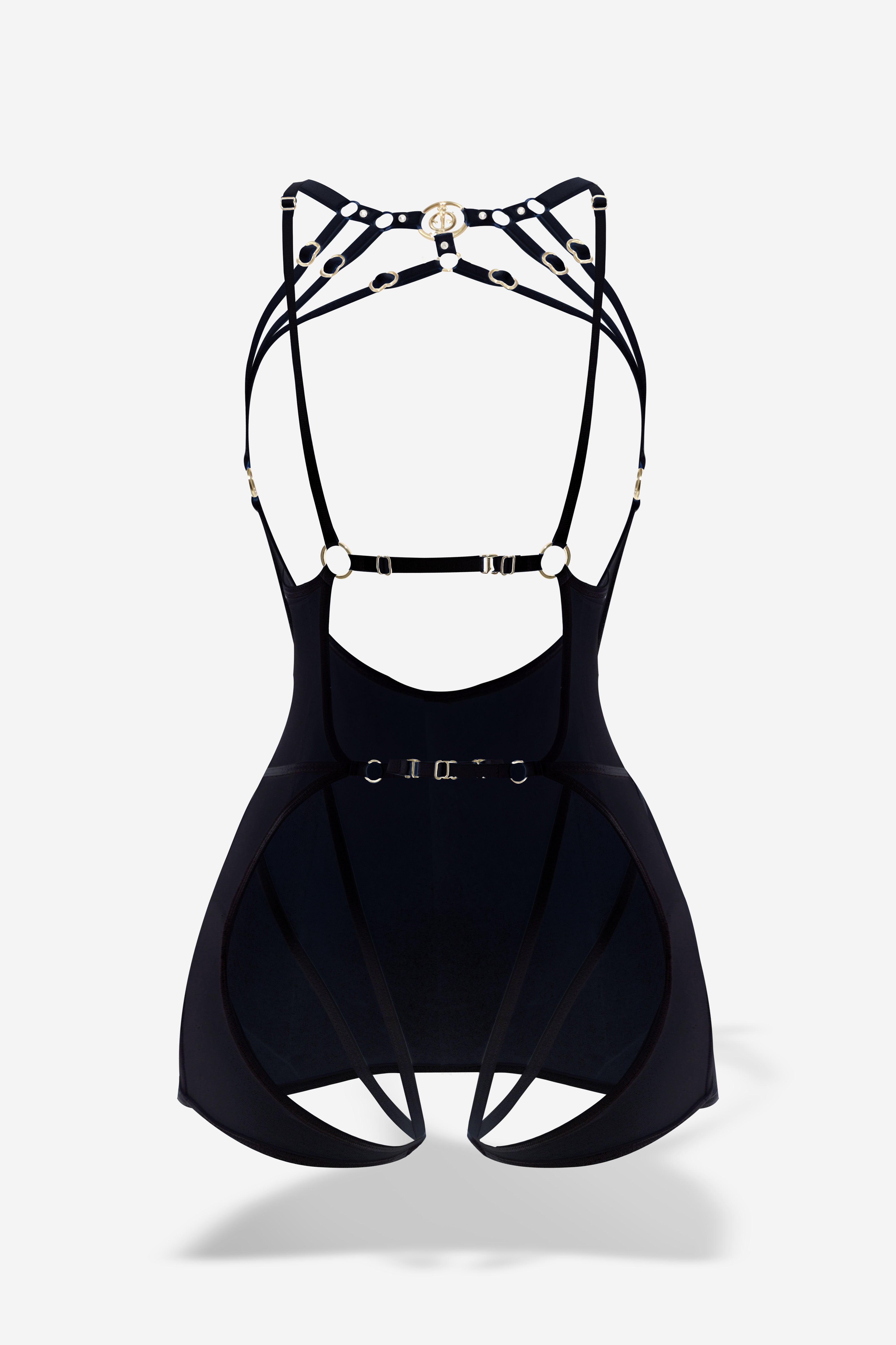 Kiana Contour Waspie is a fully ouvert, crotchless design with contour silhouettes and extended sides that lift and frame the bum, continuing elegantly around the legs. Couture-inspired for lovers of exclusive, unique pieces, it is crafted from sheer mesh and lined with silky-shine elastics. Fully adjustable with a centre-back swan-hook fastening, 18K gold signature components, and hand-sewn Swarovski Xirius Rose Lochrose beads around the neck. Ethically handmade in Europe for an everlasting love affair.