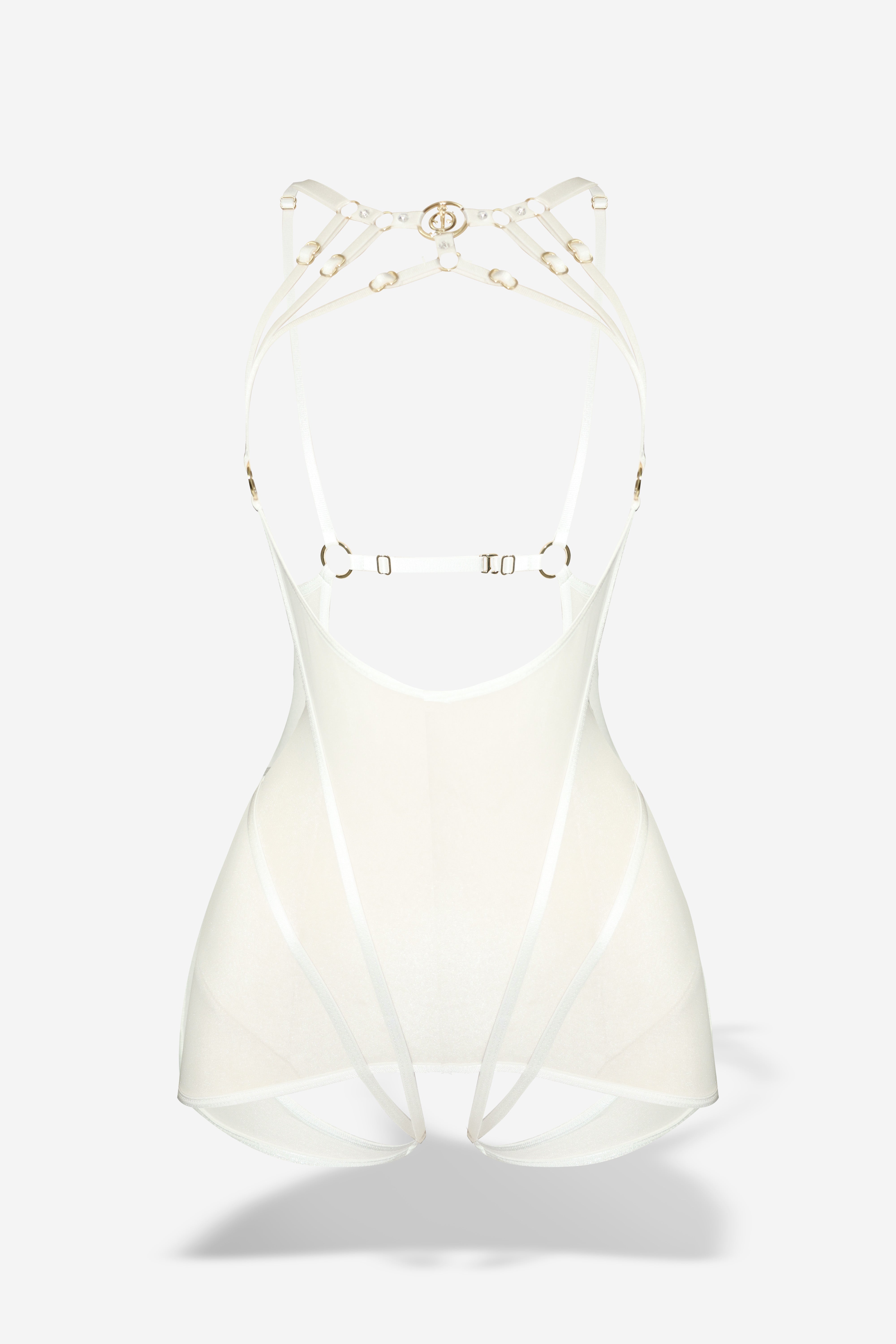 Kiana Contour Waspie is a fully ouvert, crotchless design with contour silhouettes and extended sides that lift and frame the bum, continuing elegantly around the legs. Couture-inspired for lovers of exclusive, unique pieces, it is crafted from sheer mesh and lined with silky-shine elastics. Fully adjustable with a centre-back swan-hook fastening, 18K gold signature components, and hand-sewn Swarovski Xirius Rose Lochrose beads around the neck. Ethically handmade in Europe for an everlasting love affair.
