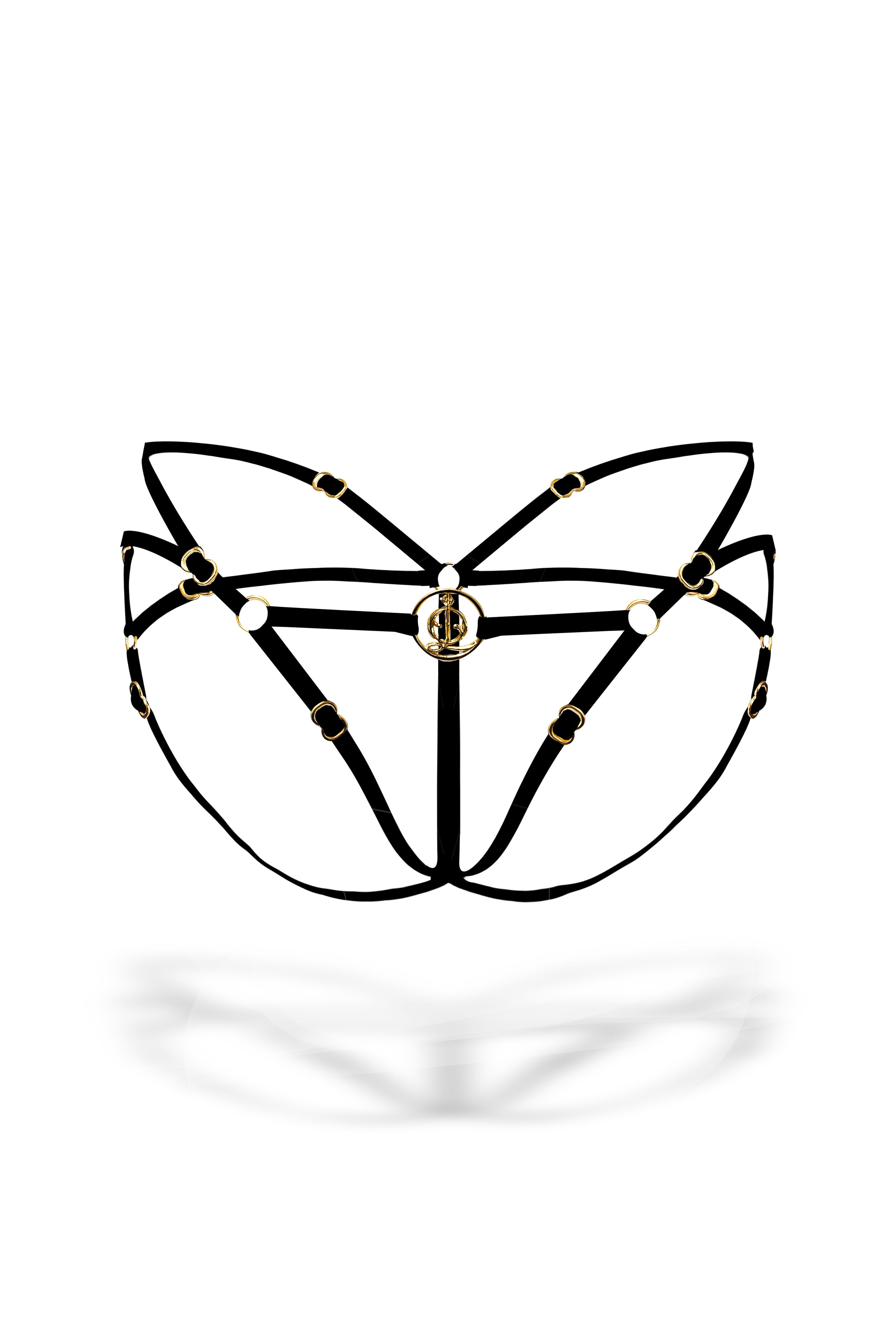 Kira Brief is a sculpting harness-style design with adjustable straps, gleaming 18K gold-plated hardware, and our signature logo ring—lifting and accentuating curves for bold confidence. Pair it with the Kira Bra for a striking, cohesive look. Ethically handmade in-house, each piece promises longevity for an everlasting love affair.
