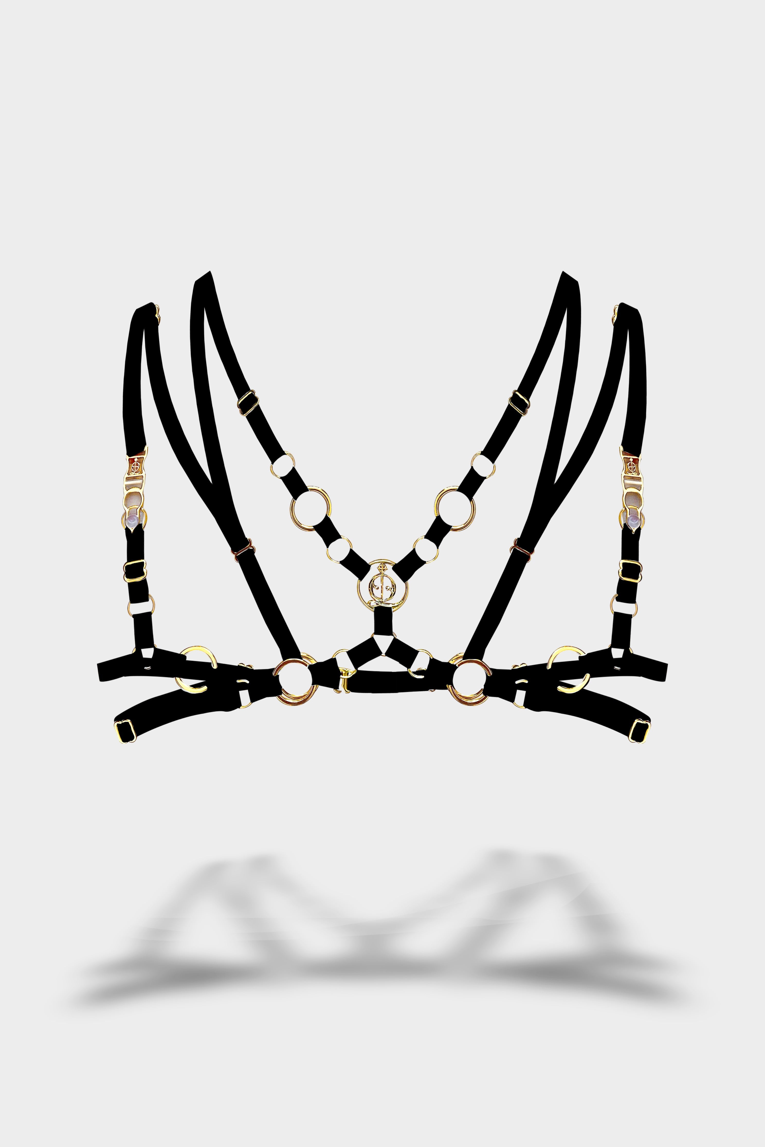 Medea Bra is the ultimate power-play harness, richly detailed with 18K gold-plated hardware and our signature logo ring, fully adjustable via swan-hook back fastening to channel the fierce, passionate energy of the Cancer warrior. Crafted from soft-elastic straps that sculpt and support, it transitions effortlessly under, over, or on its own as a mesmerizing centerpiece. Ethically handmade in-house, each piece promises longevity for an everlasting love affair.