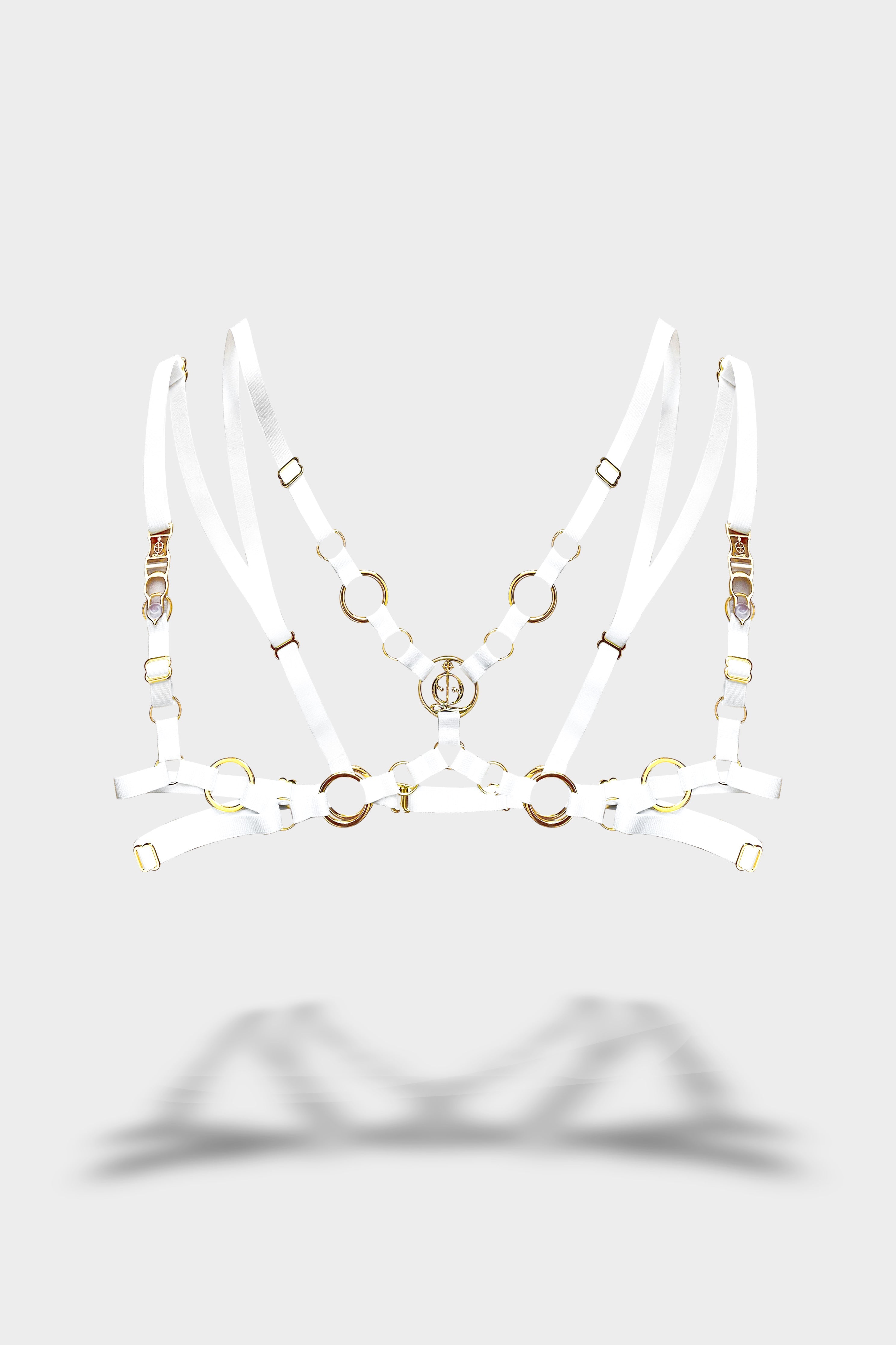 Medea Bra is the ultimate power-play harness, richly detailed with 18K gold-plated hardware and our signature logo ring, fully adjustable via swan-hook back fastening to channel the fierce, passionate energy of the Cancer warrior. Crafted from soft-elastic straps that sculpt and support, it transitions effortlessly under, over, or on its own as a mesmerizing centerpiece. Ethically handmade in-house, each piece promises longevity for an everlasting love affair.