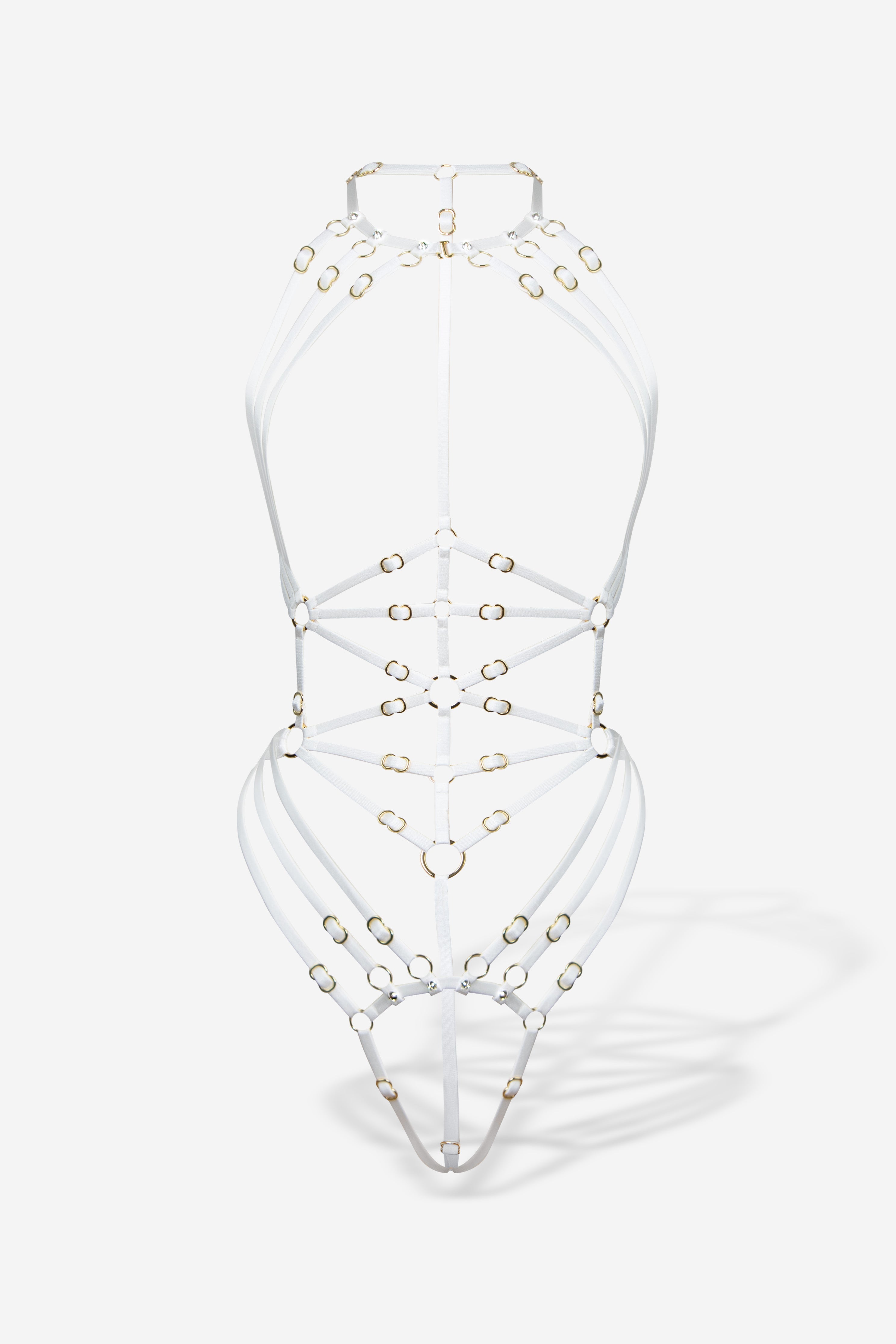 Mona Body is a masterpiece inspired by the delicate beauty of the female form—crafted from the softest quality elastication with fully adjustable straps for a flawless fit, featuring 18K gold-plated components and hand-set Swarovski Xirius Lochrose crystals that add exquisite sparkle, with a detail-rich back and minimalist front for effortless sophistication and seamless styling alongside any mesh body. Ethically handmade in-house, each piece promises longevity for an everlasting love affair.